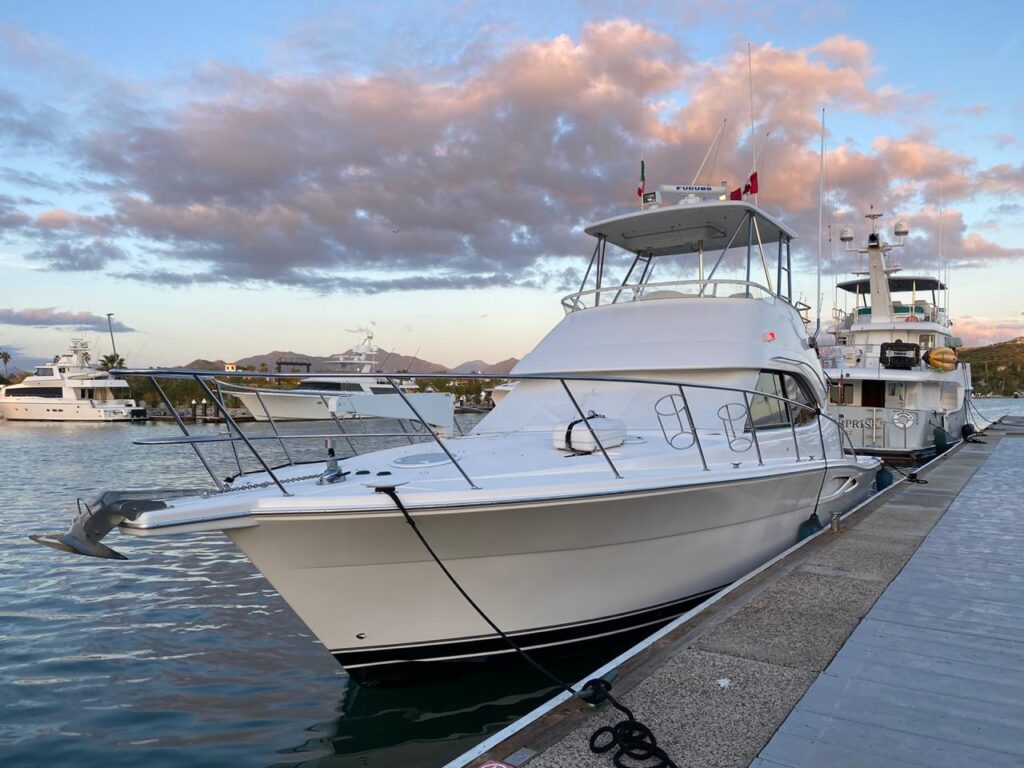 Quick answer: Private Riviera 43ft yacht charters departing from Puerto Los Cabos. Choose 4h, 6h, or 8h. Includes yacht, A/C cabin, bathroom, captain & crew, ice & water. Add-ons on request: catering/open bar, decorations, photographer, transfers.